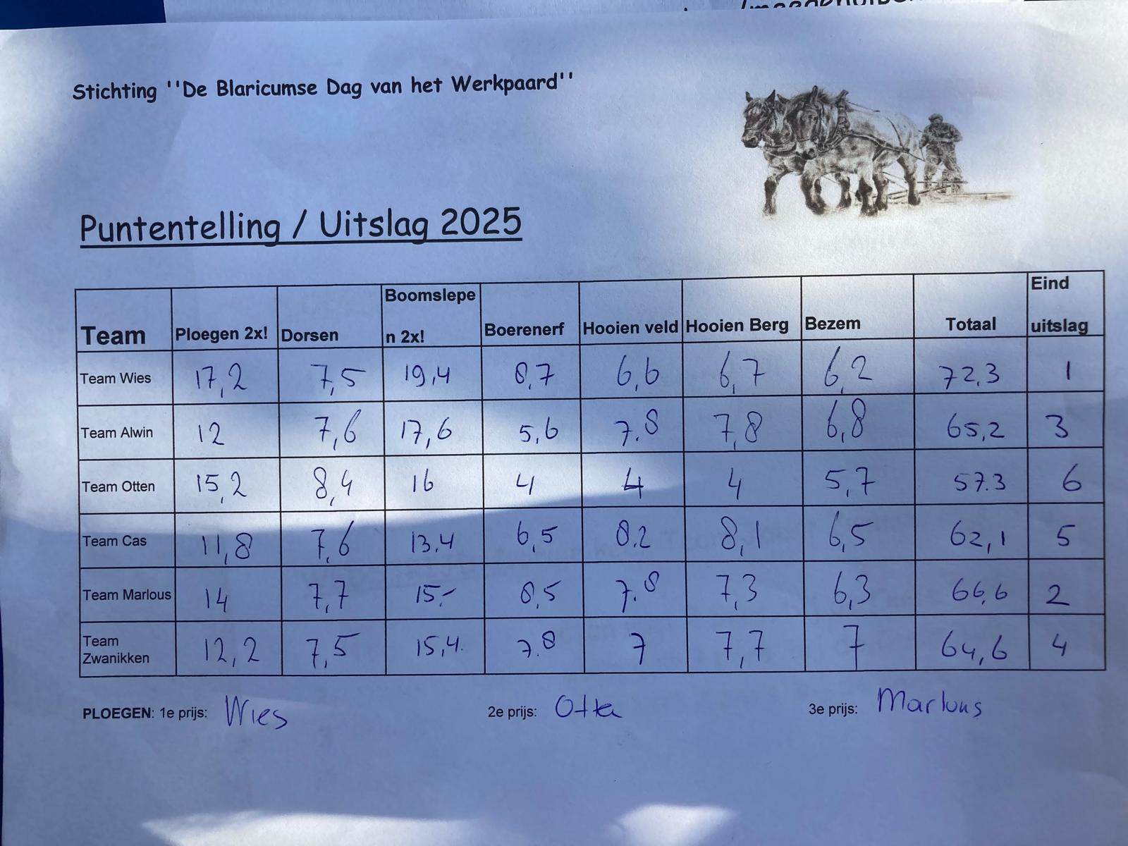 Team | Ploegen 2x! | Dorsen | Boomslepen 2x! | Boerenerf | Hooien veld | Hooien Berg | Bezem | Totaal | Einduitslag |